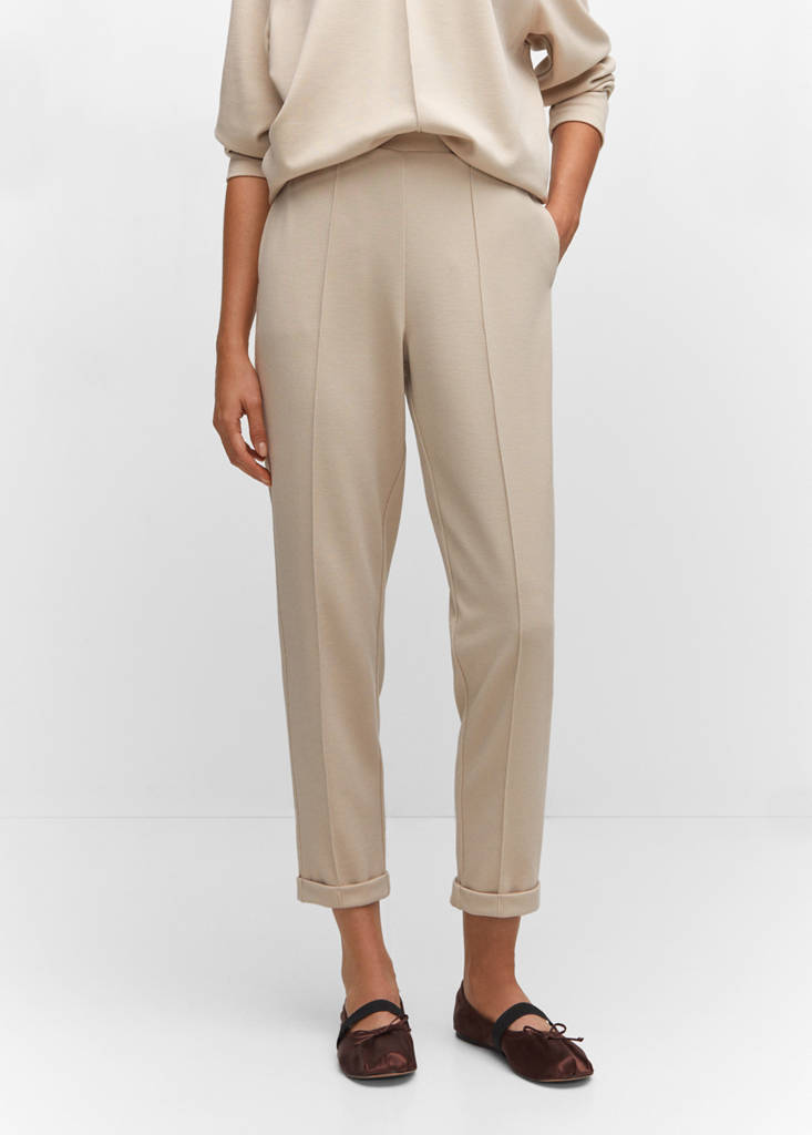 Tissu fluide. Coupe jogging. Taille haute. Taille élastiquée. Sans fermeture. Poches latérales. Coutures décoratives. Revers. Total look