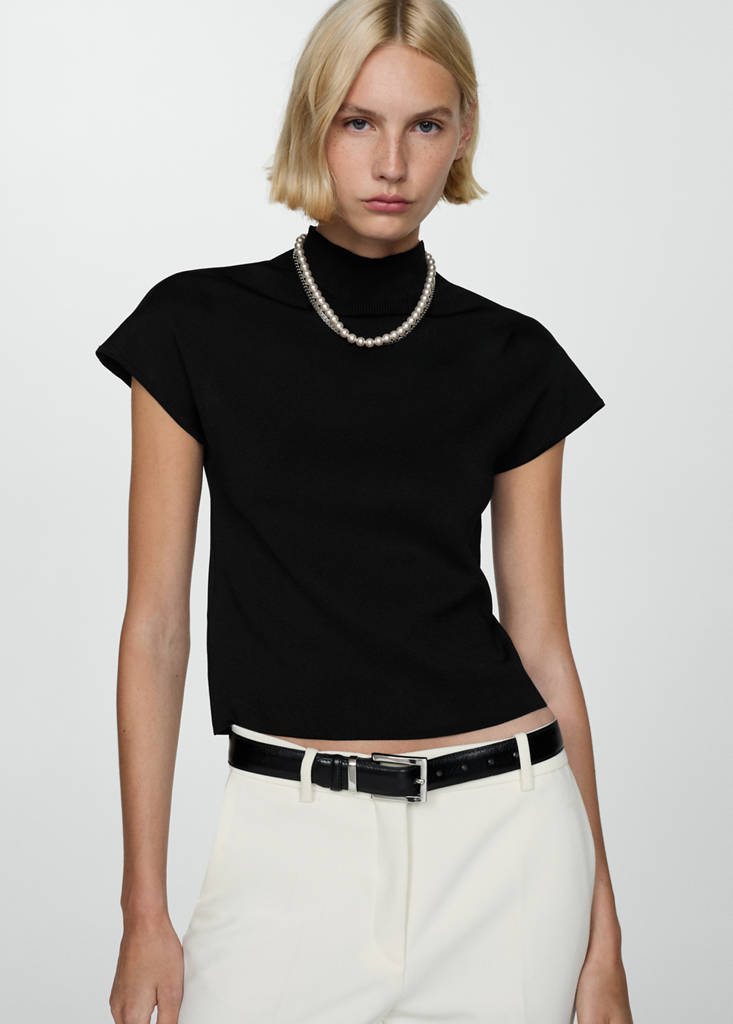 Tissu en grosse maille. Coupe droite. Col Perkins. Col côtelé. Manche courte