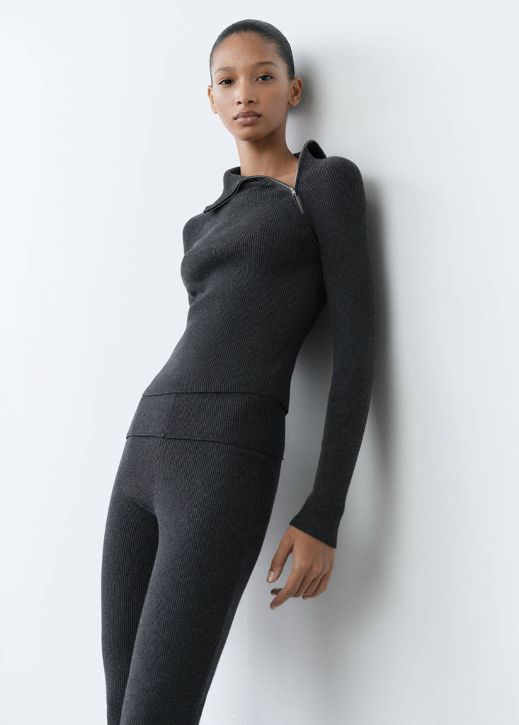 Tissu en maille côtelée. Maille fine. Coupe ajustée. Col montant à fermeture Éclair. Manche longue. Total look