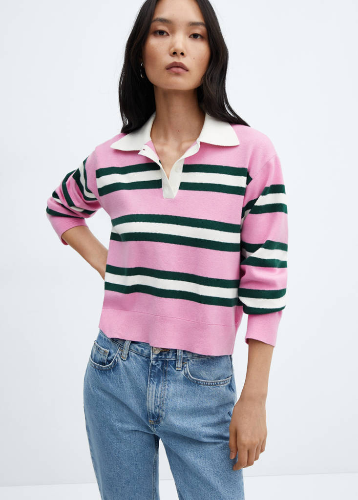 Tissu en maille fine, coupe droite, imprimé rayures, col polo boutonné, manches longues.