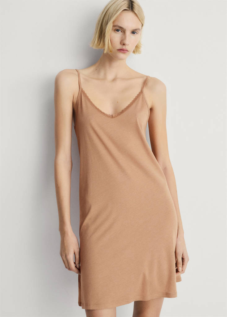 Chemise de nuit. Tissu mélange de modal et coton. Texture agréable. Finitions en dentelle contrastées. Col en V. Bretelles fines. Offre confort et liberté de mouvement. Disponible en plusieurs couleurs