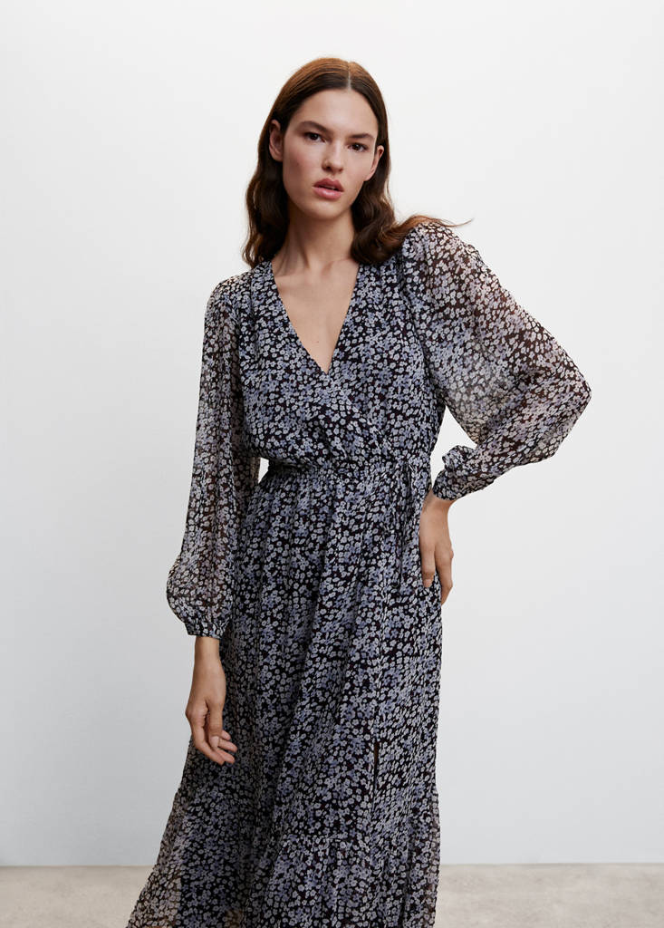 Tissu fluide. Tissu semi-transparent. Imprimé floral. Coupe midi. Évasé. Col cache-cœur en V. Manches longues bouffantes. Fermeture latérale à nœuds. Doublure. Disponible Plus. Collection fêtes et cérémonies