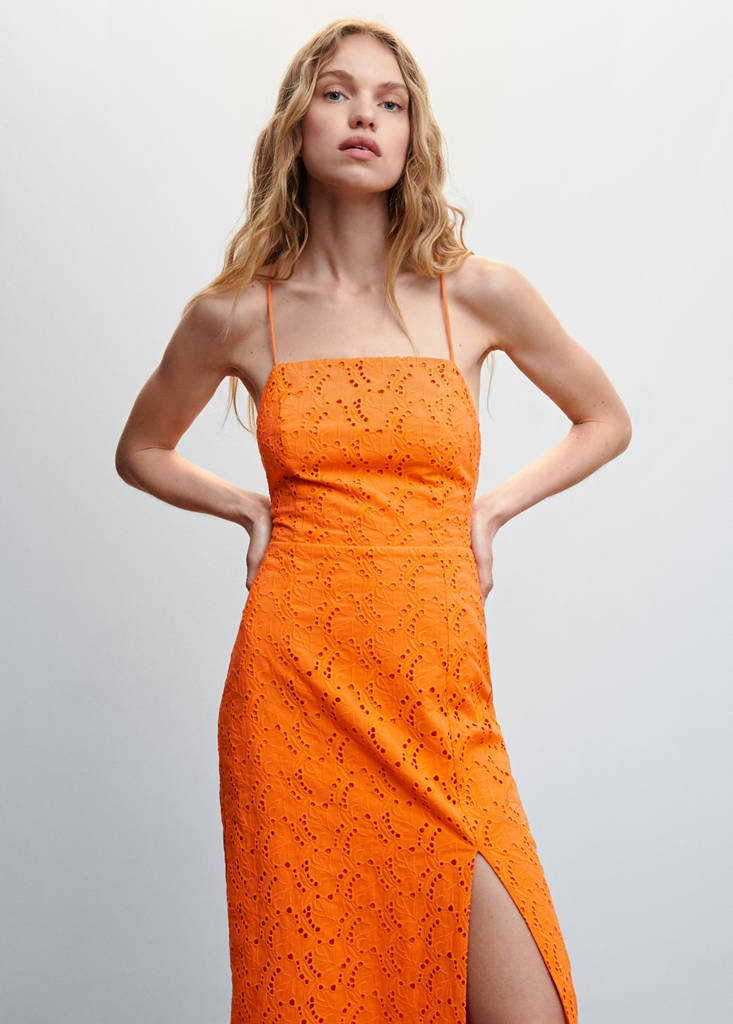 Tissu 100 % coton. Tissu ajouré. Coupe droite. Coupe midi. Col droit. Bretelles fines. Bretelles croisées dans le dos. Lien à nouer au dos. Fermeture Éclair à l'arrière. Fente latérale