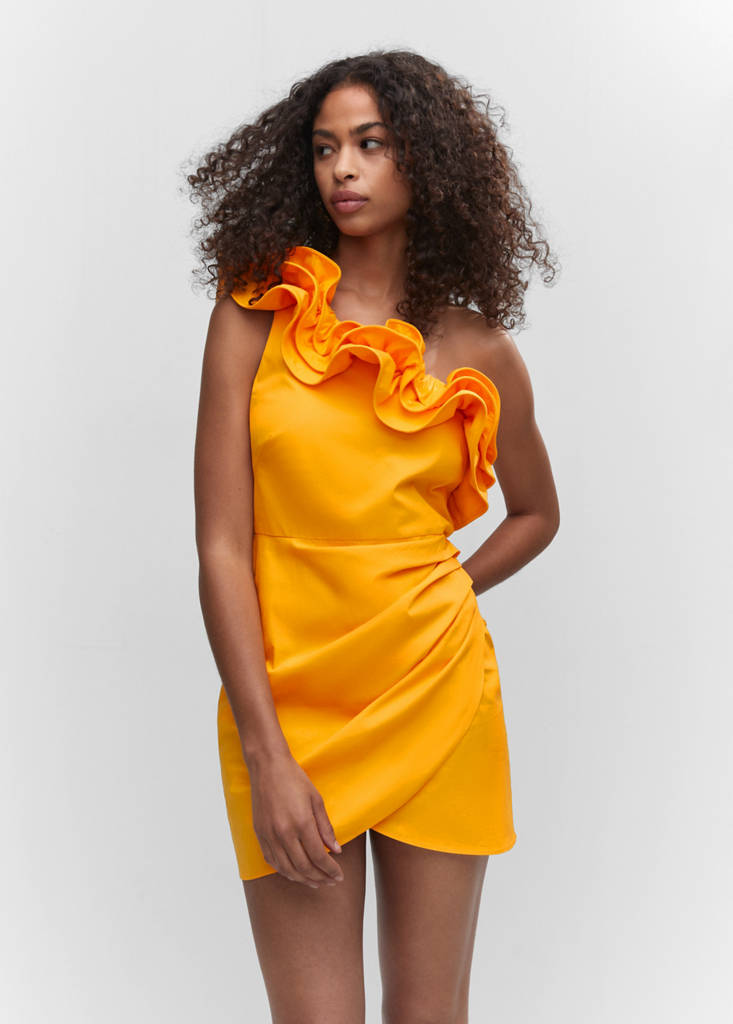 Tissu de coton mélangé. Croisé. Coupe cintrée. Coupe courte. Col asymétrique. Détails volantés. Sans manches. Fermeture Éclair latérale. Collection fêtes et cérémonies