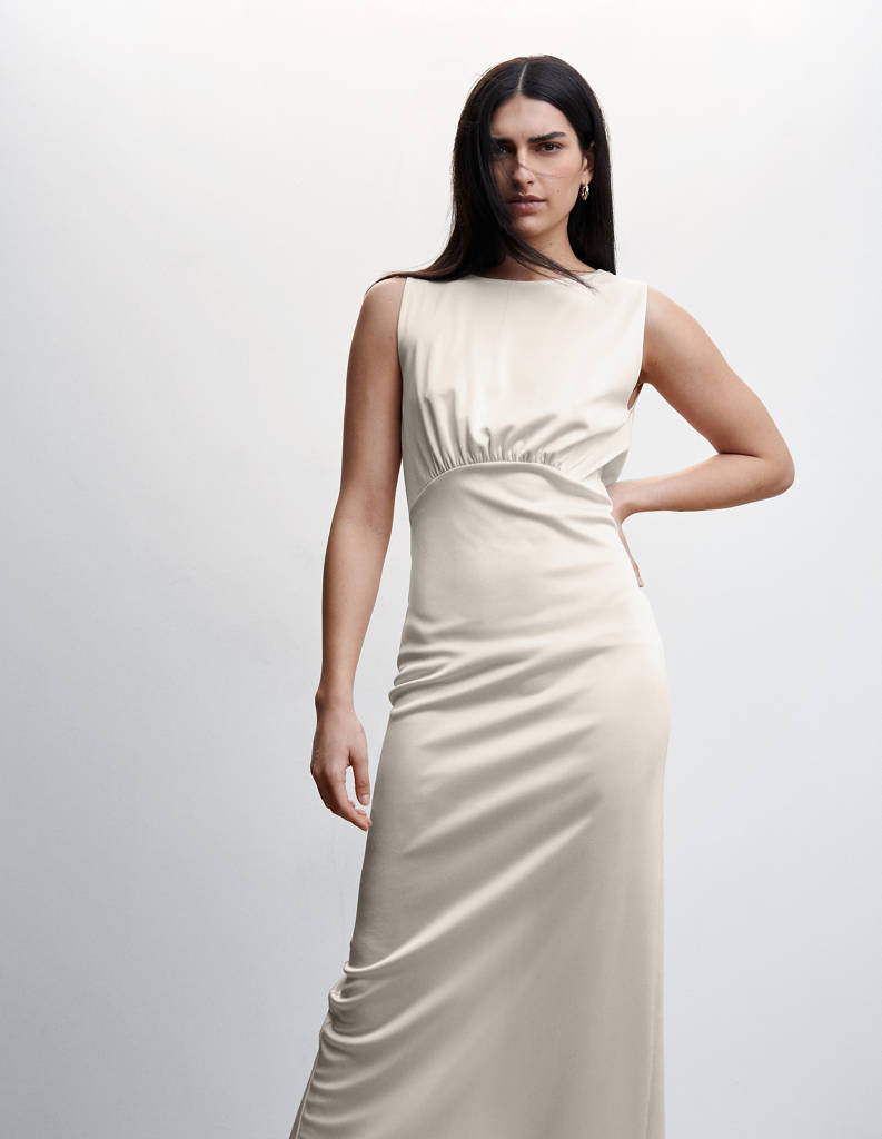 Tissu fluide. Ouverture au dos. Détail drapé. Ajusté. Coupe midi. Bretelles larges. Nœud décoratif au dos. Longueur du vêtement 135 cm. Collection fêtes et cérémonies