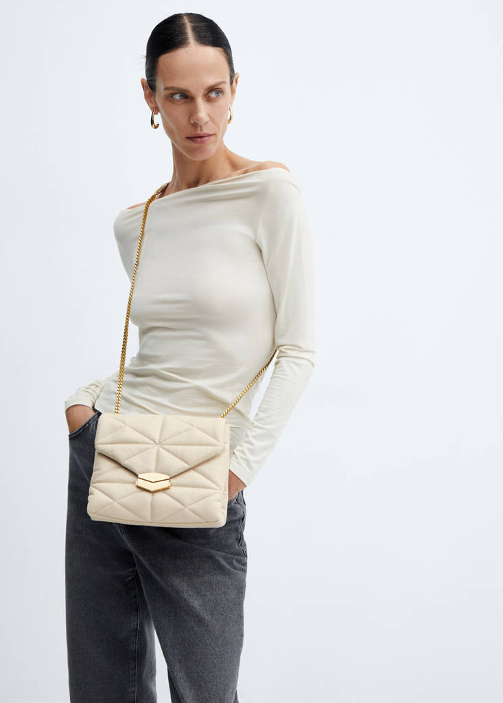 Taille moyenne. Design matelassé. Bandoulière. Anse longue en chaîne. Double compartiment intérieur. Fermeture à rabat. Fermeture métallique à pression. Doublure