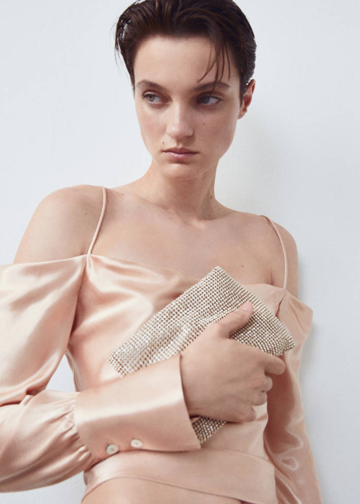 Motif en strass, petite taille, anse longue en chaîne, fermoir métallique aimanté, doublure, collection fêtes et cérémonies.
