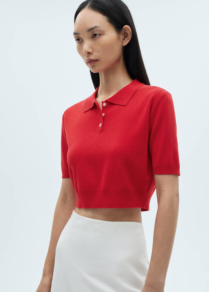 Maille fine. Design crop. Coupe droite. Col polo. Manche courte. Fermeture à boutons sur le devant