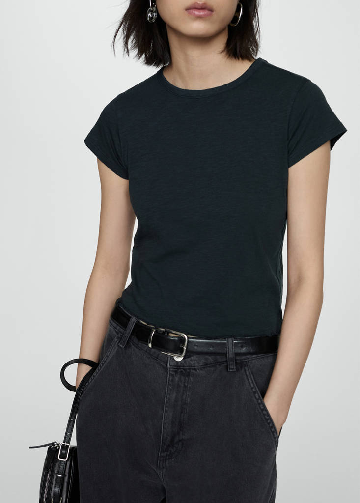 Coupe droite. Design crop. Col rond. Manche courte. Bords surpiqués. Coton lavé. Tissu 100% coton