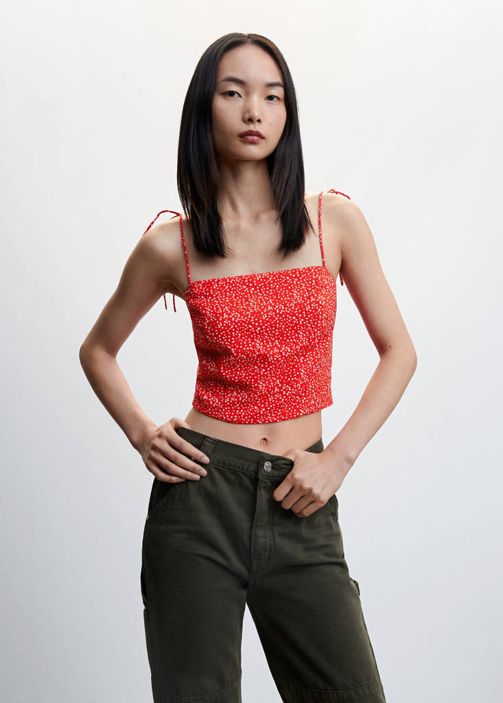 Tissu fluide. Imprimé à pois. Style crop. Coupe droite. Col échancré. Fines bretelles avec fermeture à nœud. Empiècement froncé. Empiècement élastique