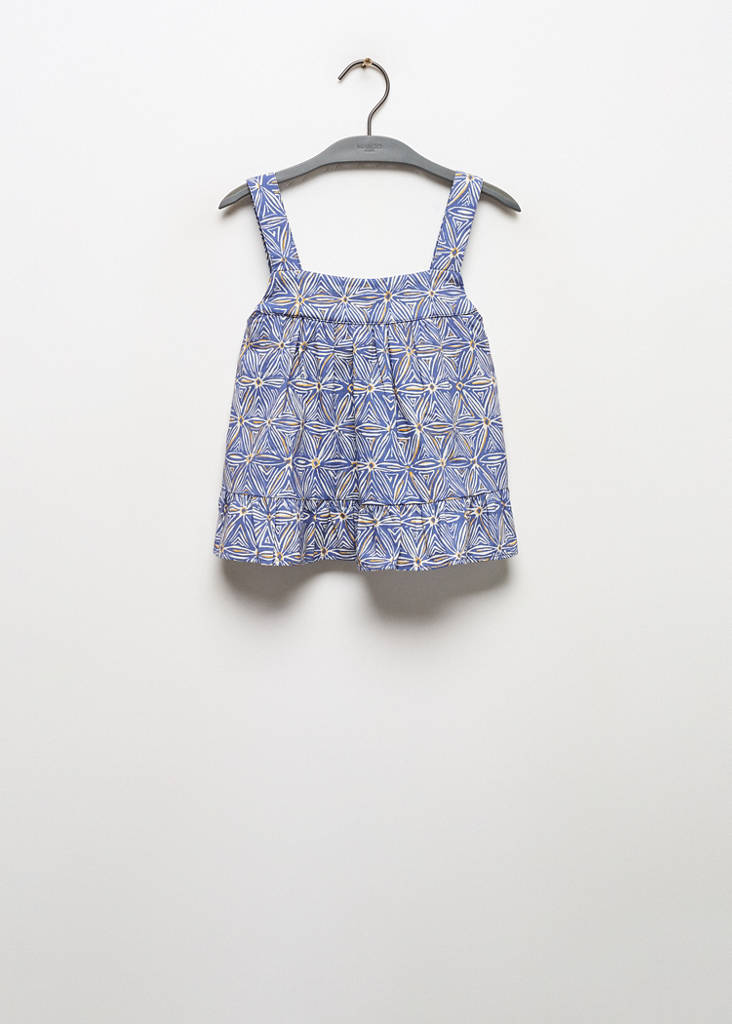 Collection fêtes, cérémonie et communion. Tissu léger. Imprimé. Bretelles larges. Encolure carrée. Sans manches. Coupe standard. Base volantée. Ouvertures et volants sur le bas. Fermeture arrière. Fermeture à boutons