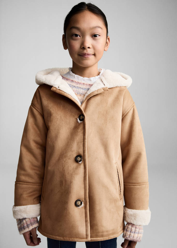 Tissu suédine. Coupe droite. Design long. Col rond. Capuche. Manche longue. Intérieur en imitation fourrure. Deux poches latérales. Étiquette d'identité à l'intérieur. Fermeture à boutons
