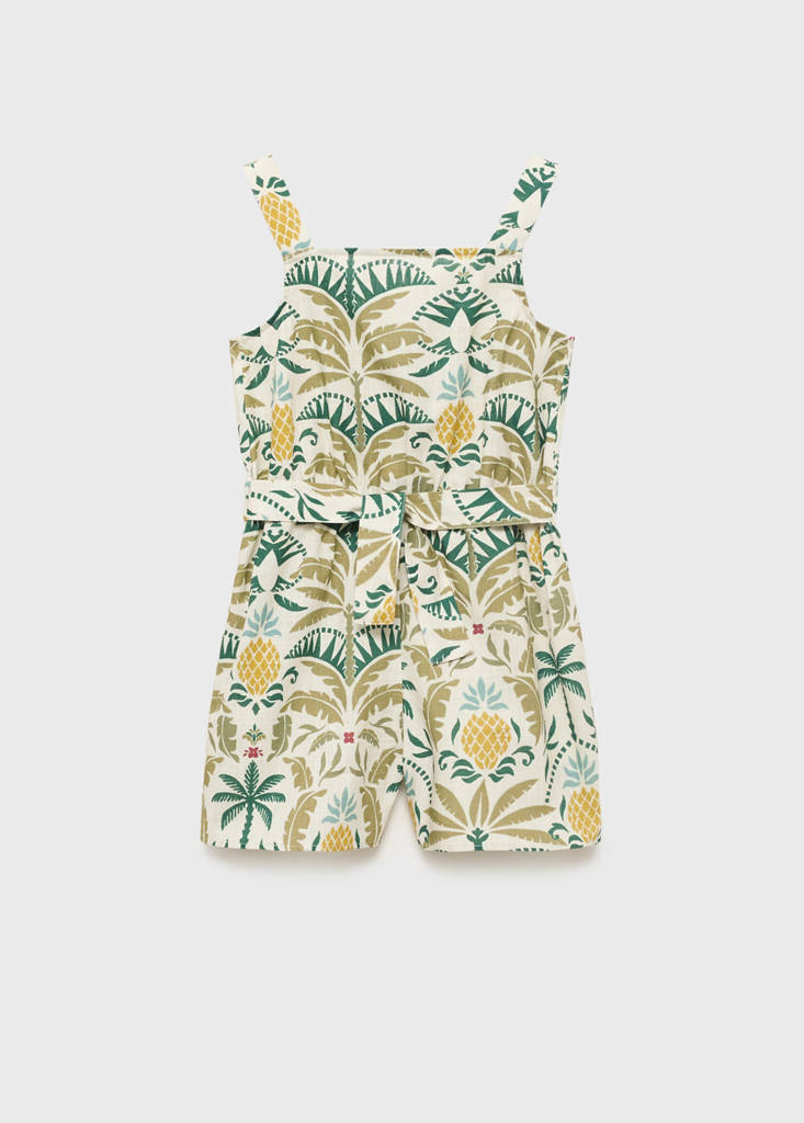 Tissu 100% coton. Coupe droite. Motif imprimé. Imprimé de palmiers. Col droit. Bretelles. Détail de lien à la taille
