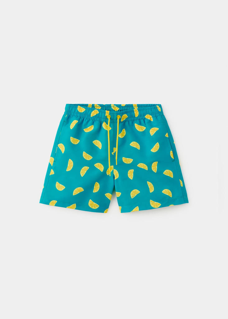 Tissu élastique. Coupe droite. Coupe courte. Motif imprimé. Imprimé de citrons. Taille élastique avec cordon ajustable. Cordon en contraste. Deux poches latérales. Collection bain