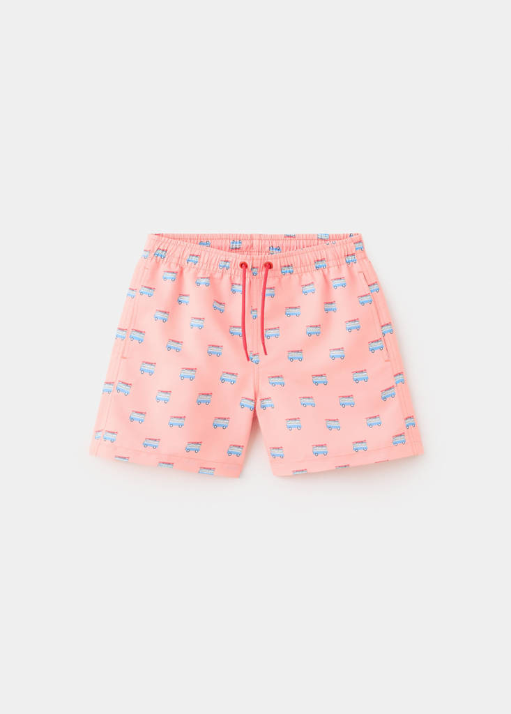 Tissu élastique. Coupe droite. Coupe courte. Motif imprimé. Taille élastique avec cordon ajustable. Cordon en contraste. Deux poches latérales. Collection bain