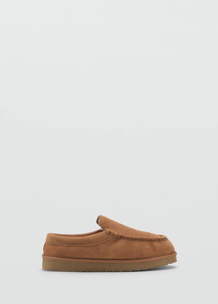 Style sabot. Daim. Doublure imitation mouton retourné. Détails surpiqués. Semelle en caoutchouc. Bout arrondi