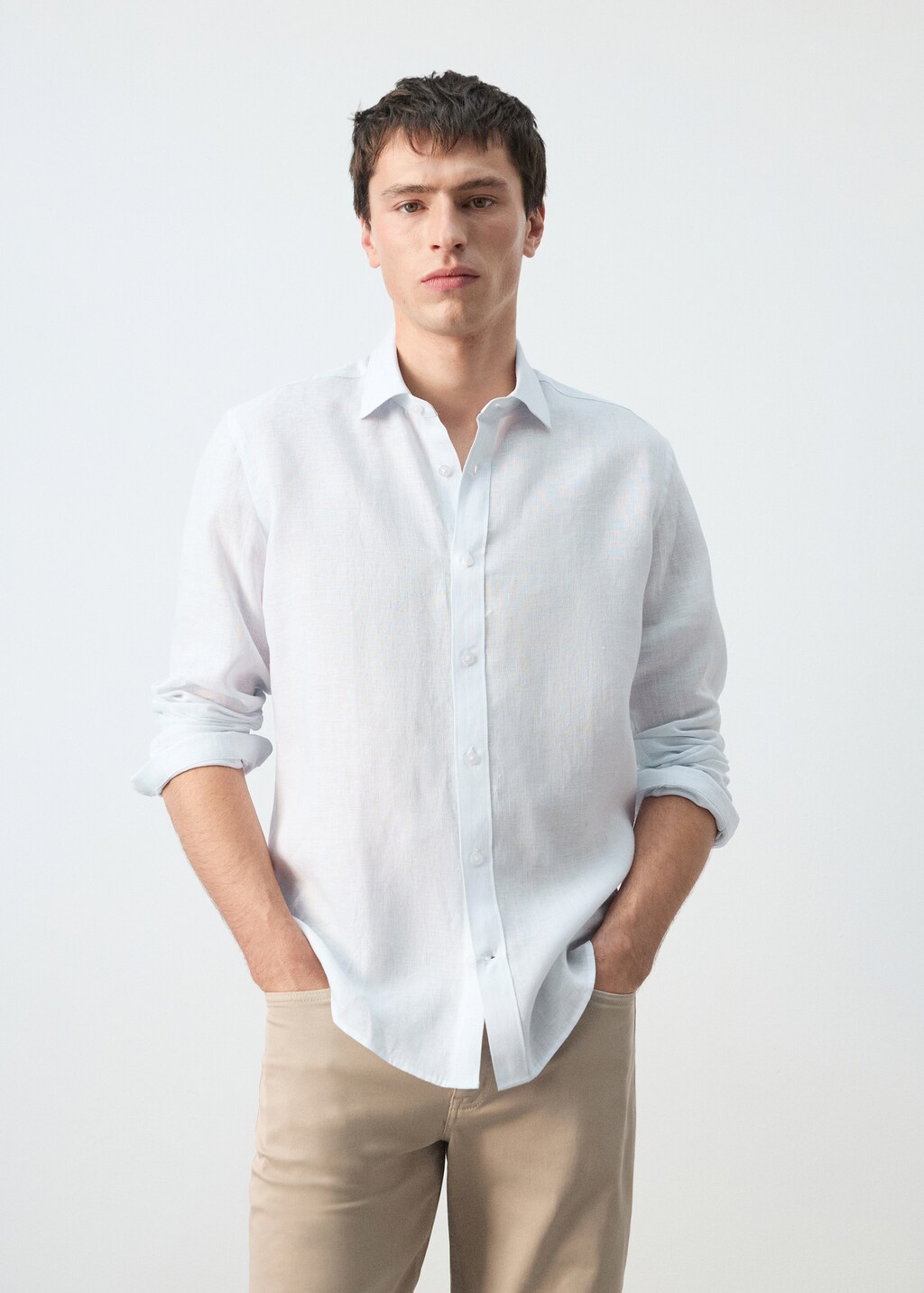 ESSENTIALS: Conçus pour durer. Coupe regular. Tissu 100% lin. Design à rayures fines. Col chemise. Manches longues et poignets boutonnés. Pinces à l’arrière. Fermeture avant avec boutons. Ourlet arrondi.