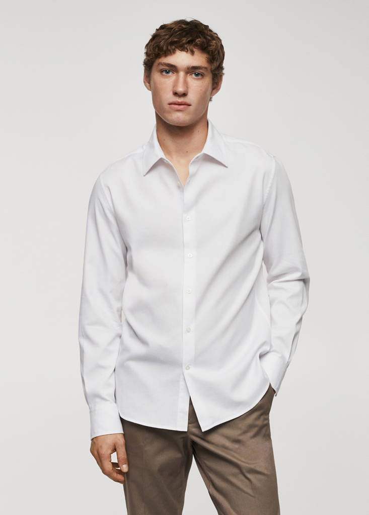 Collection Essentiels. Tissu structuré. Slim fit. Fermeture à bouton sur le devant. Manches longues et poignets boutonnés. Ourlet arrondi. Col classique. Tissu 100% coton. Coupe standard