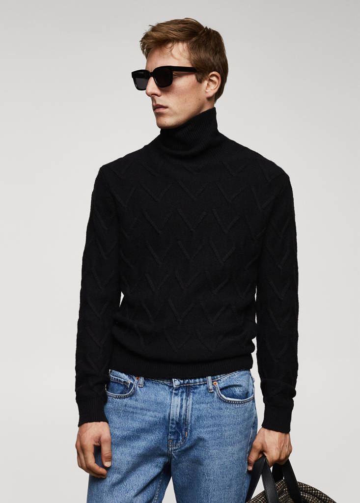 Tissu de laine mélangé, maille moyenne, regular-fit, col montant, tissu à structure brodée, manches longues avec poignets élastiques, bas droit, bords côtelés contrastés au niveau du col, des manches et sur le bas, le mannequin mesure 190 cm et porte une taille M.