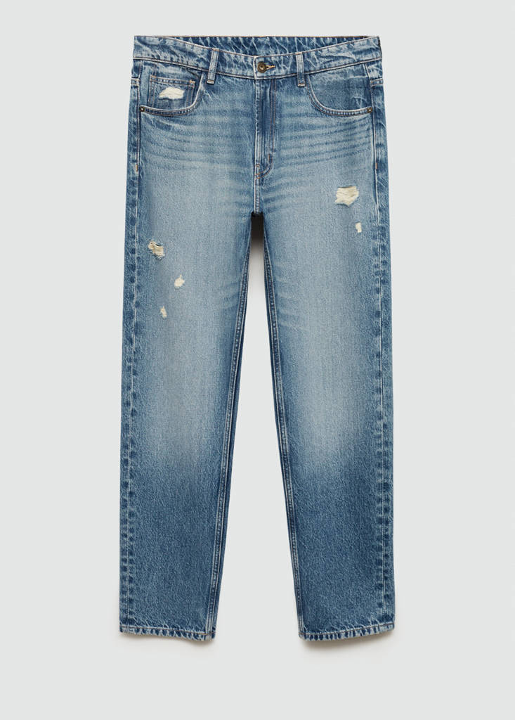 Straight-fit. Taille mi-haute. Délavé clair effet usé. Détail déchirures décoratives. Passants de ceinture. Deux poches avant. Poche gousset au niveau des hanches à l’arrière. Deux poches plaquées à l'arrière. Fermeture Éclair et bouton à l’avant. Tissu 100% coton
