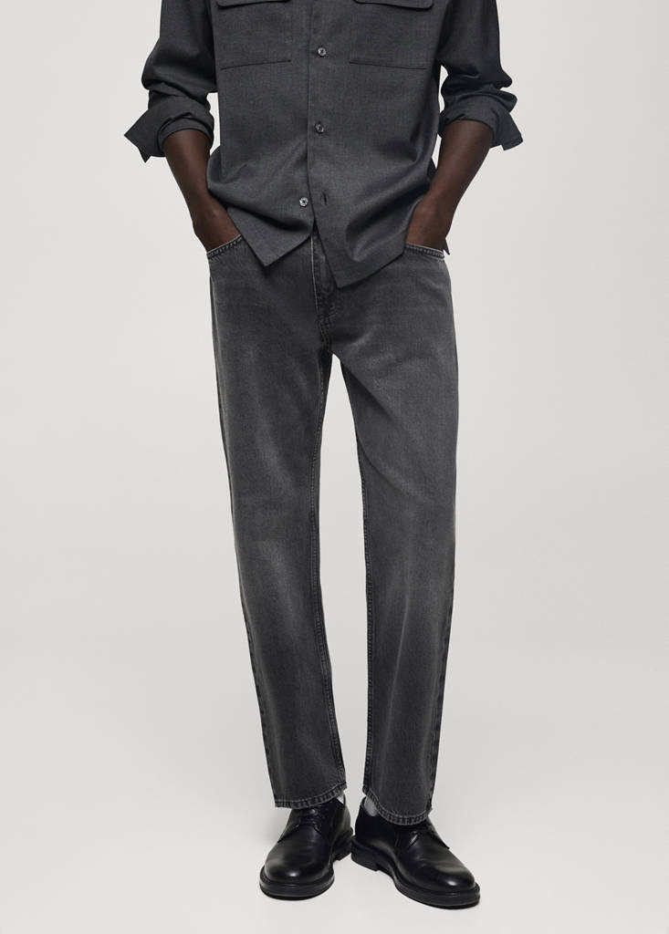 Straight-fit. Délavage gris foncé. 100 % coton. Passants de ceinture. Deux poches avant. Poche gousset au niveau des hanches. Deux poches plaquées à l'arrière. Fermeture Éclair et bouton à l’avant