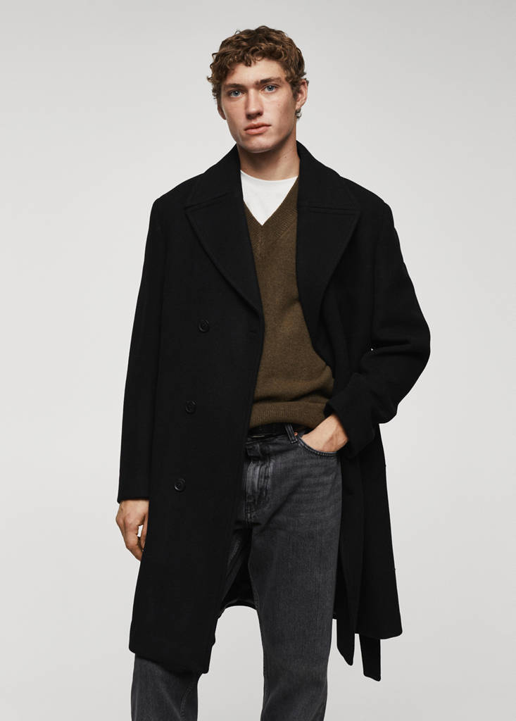 Tissu de laine mélangé. Coupe regular. Design long. Col à revers larges. Fermeture avant à boutons croisés. Deux poches latérales. Ceinture de style peignoir. Ouverture arrière en bas. Doublure. Poche intérieure