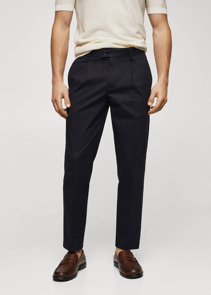 Slim-fit. Tissu de coton mélangé. Pinces. Passants pour la ceinture. Deux poches latérales. Deux poches passepoilées boutonnées à l'arrière. Fermeture Éclair avec bouton. Le mannequin mesure 183 cm et porte une taille 42. Collection Essentiels. Campagne Antoine Griezmann