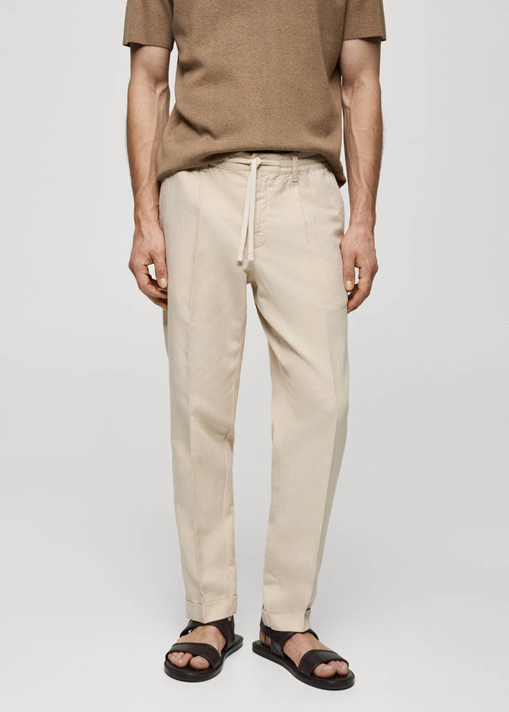 Ensemble disponible en total look. Slim fit. Tissu mélange de coton et lin. Taille élastique avec cordon ajustable. Passants de ceinture. Deux poches avant. Détail de pli à l'avant. Deux poches passepoilées avec bouton à l'arrière. Revers. Fermeture Éclair et bouton à l’avant. Détail de pli marqué à l'avant et à l'arrière