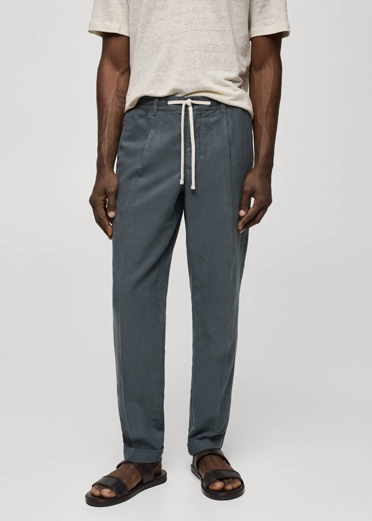 Ensemble disponible en total look. Slim fit. Tissu mélange de coton et lin. Taille élastique avec cordon ajustable. Passants de ceinture. Deux poches avant. Détail de pli à l'avant. Deux poches passepoilées avec bouton à l'arrière. Revers. Fermeture Éclair et bouton à l’avant. Détail de pli marqué à l'avant et à l'arrière