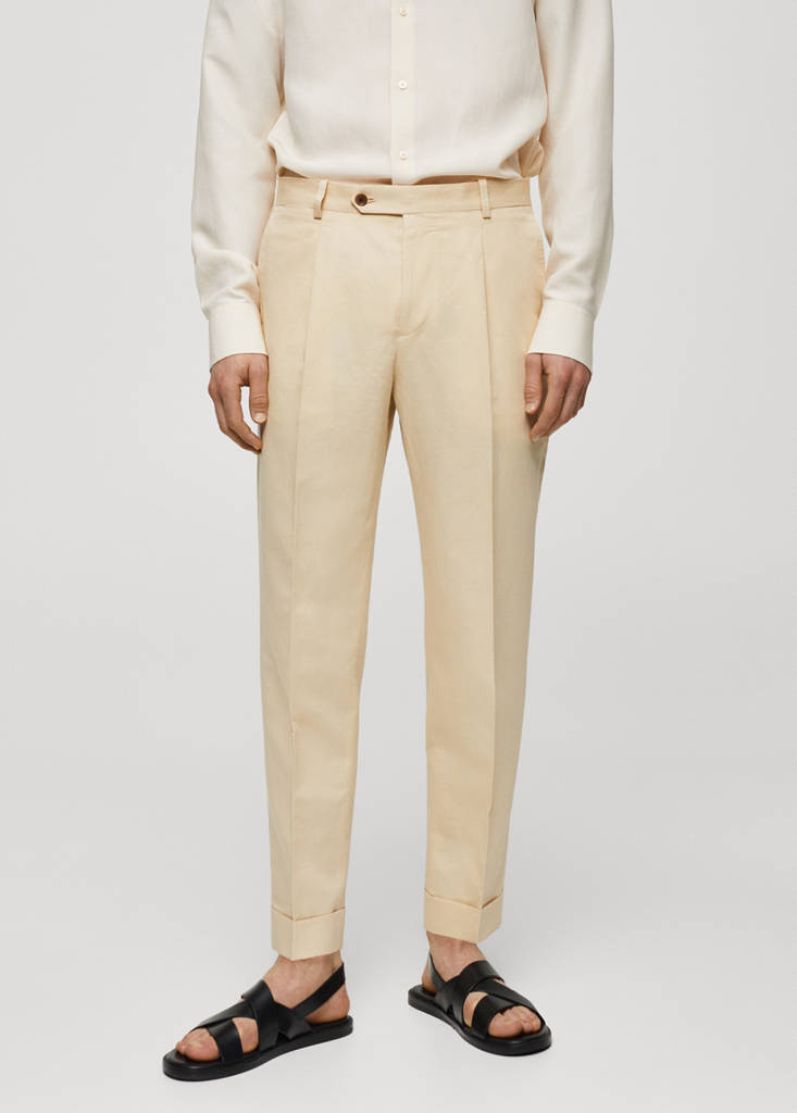 Tissu mélange de lin et coton. Conçu en Italie. Fabriqué au Portugal. Slim fit. Passants de ceinture. Boutons à l'intérieur de la taille pour les bretelles. Fermeture avant zippée, double agrafe et bouton intérieur. Détail de pli à l'avant. Deux poches avant. Deux poches passepoilées avec bouton à l'arrière. Revers. Tissu de la société italienne Tessuti di Sondrio, fabricant de textiles de haute qualité. Détail de pli marqué à l'avant et à l'arrière