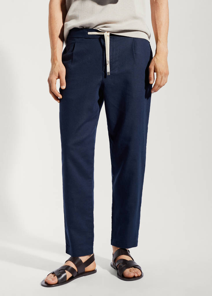 Tissu mélange de lin et coton. Double bouton et fermeture Éclair. Cordon de serrage à la taille. Taille élastiquée. Deux poches avant. Deux poches passepoilées à l'arrière. Ourlet droit. Slim fit. Collection Essentiels. Taille élastique avec cordon ajustable. Détail de pli à l'avant