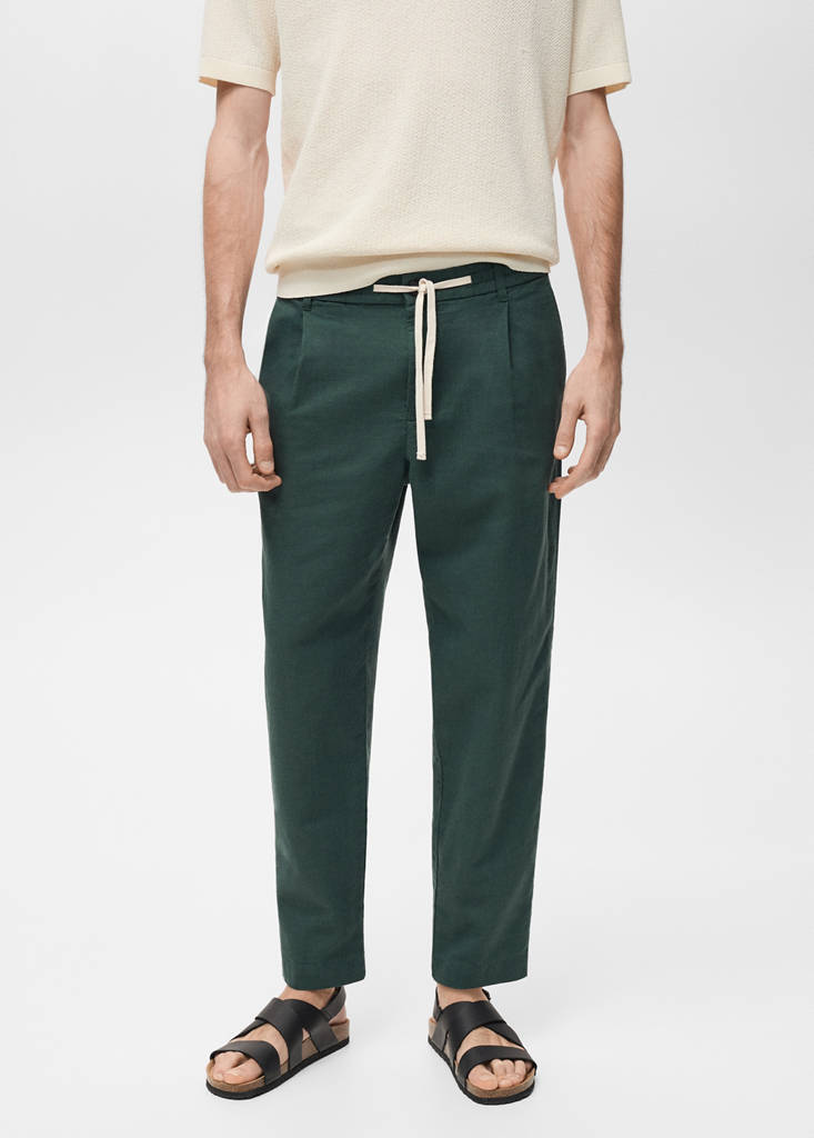 Tissu en lin mélangé. Slim fit. Taille élastique avec cordon ajustable. Cordon avec option de nouage visible ou dissimulé à l'intérieur. Passants pour ceinture. Fermeture avant à double boutonnage et fermeture éclair. Pinces sur le devant. Deux poches avant. Deux poches passepoilées avec bouton à l'arrière