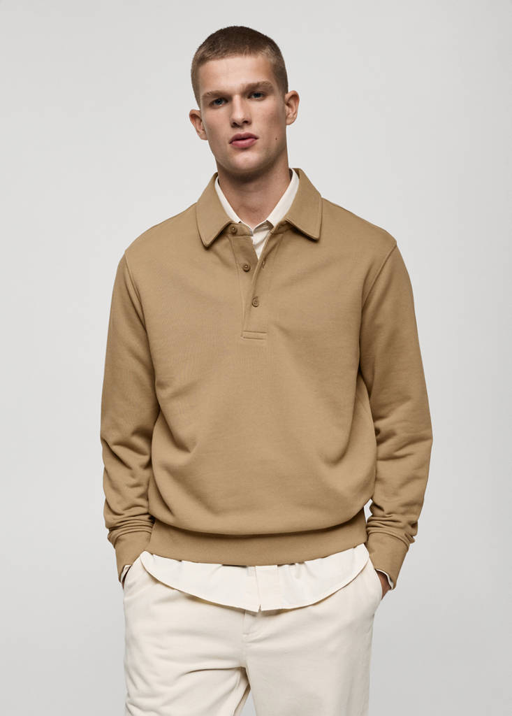 Relaxed-fit. Col polo avec fermeture à boutons. Manches longues avec poignets élastiques. Intérieur en coton gratté. Bas droit à bords côtelés. The sand model is an online exclusive. Tissu 100% coton