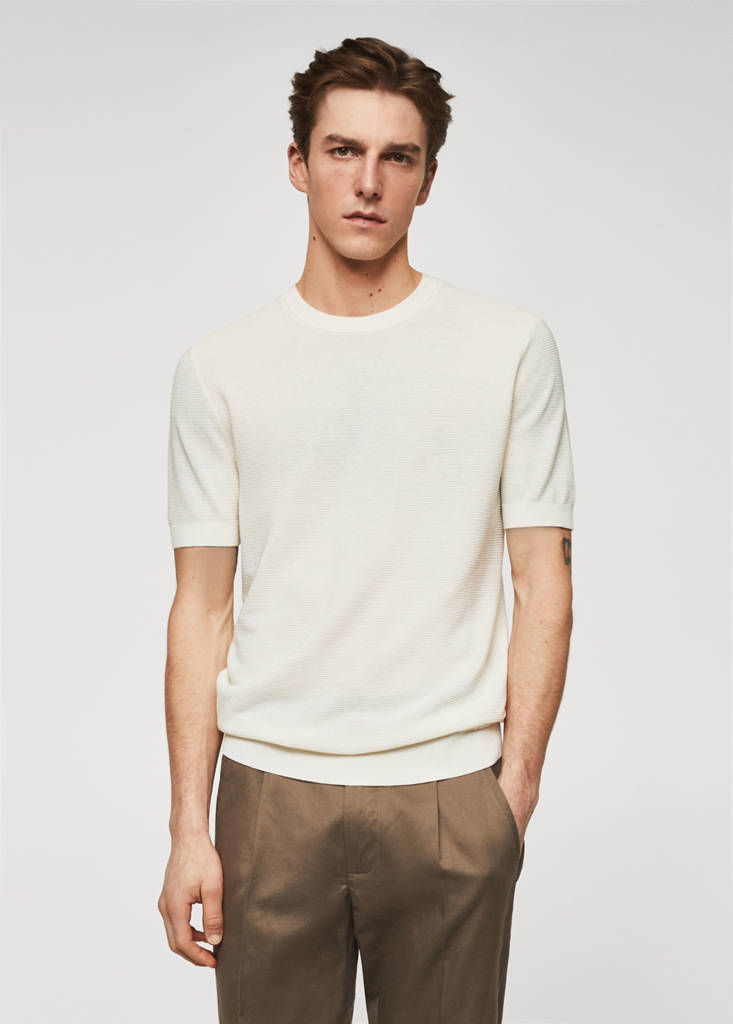 Slim-fit. Tissu en maille fine. Tissu structuré. Col rond. Manches courtes. Le mannequin mesure 187 cm et porte une taille M. Collection Essentiels. Campagne Antoine Griezmann