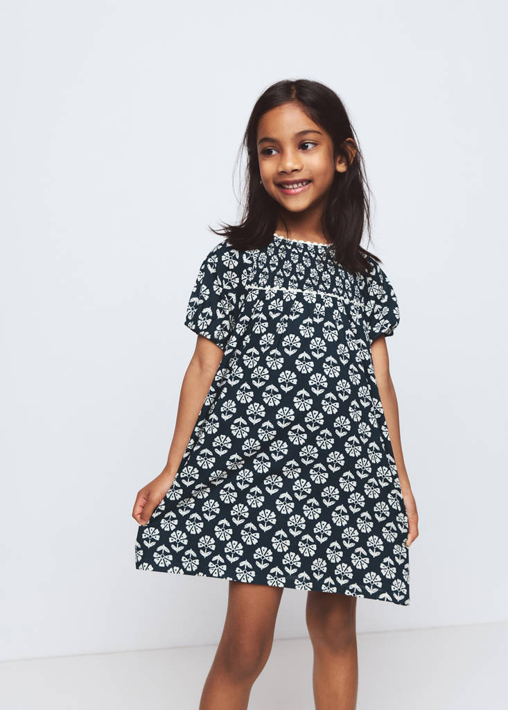 Tissu 100 % coton. Tissu imprimé à fleurs. Coupe droite. Coupe courte. Col rond. Détail froncé au col. Manches courtes. Fermeture par bouton à l'arrière