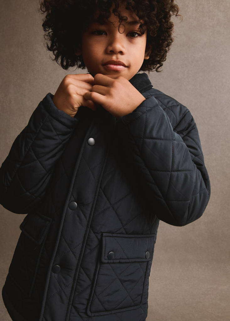 Collection Rentrée des classes. Design imperméable. Coupe droite. Structure à losanges. Col chemise. Col en velours côtelé. Manche longue. Deux poches avant à boutons-pression. Fermeture Éclair avec boutons-pression