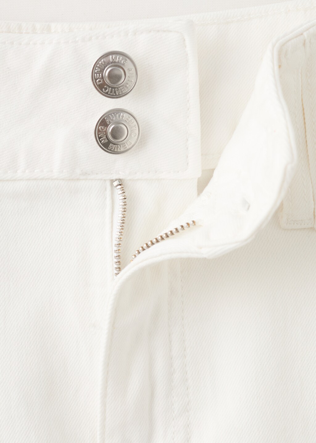 Tissu en coton style denim cowboy. Coupe droite. Design court. Passants pour ceinture. Double boutonnage. Fermeture éclair et bouton.