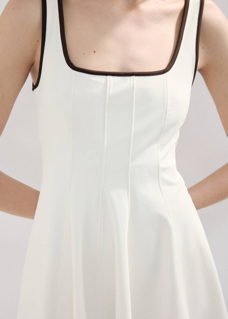 Fluid fabric. Straight design. Short design. Straight collar. Thin straps. Contrast spaghetti strap. Printed detail on the hem. With inner lining. Online Exclusive. Godo Collection