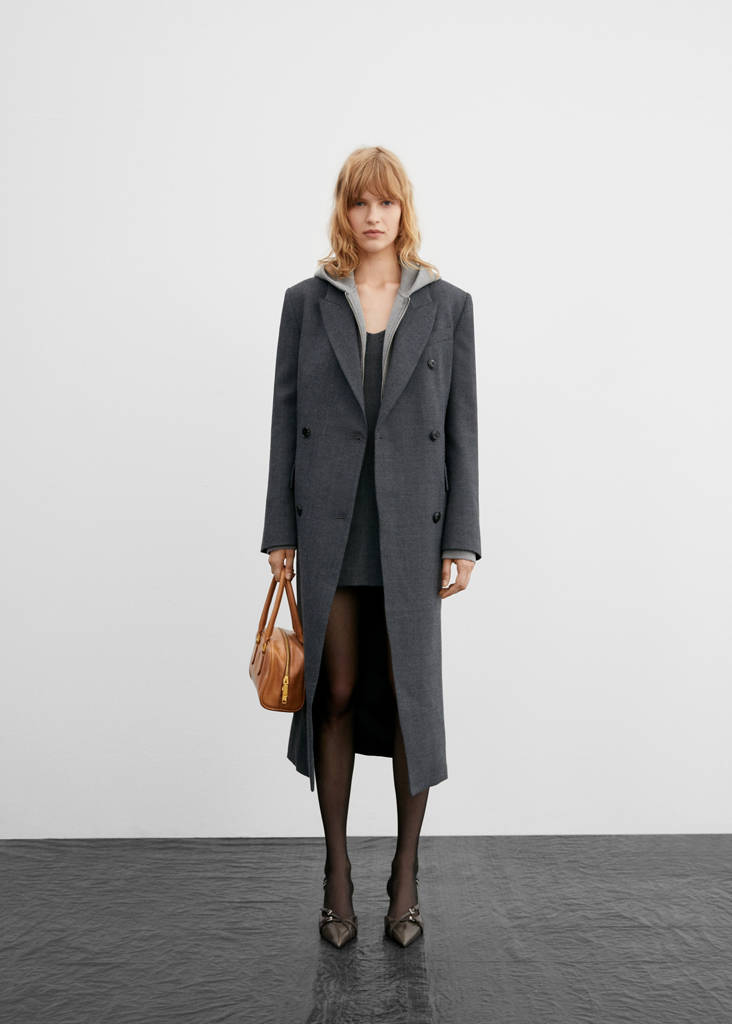 Wool fabric. Straight design. Long design. Notched lapel collar. Long sleeves. Chest welt pocket. Two side pockets with flaps. Back vent at the hem. Inner lining. Double button fastening. Office looks. Selection Collection