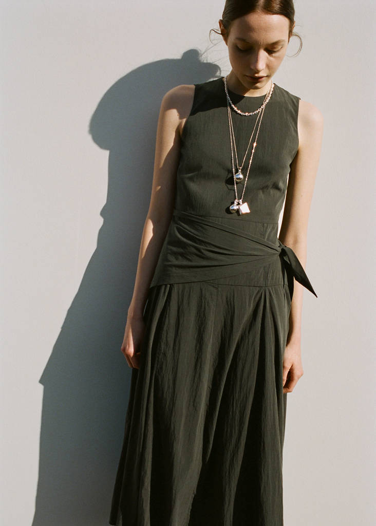 Lyocell-blend fabric. Midi design. A-line design. Round neck. Sleeveless. Wide strap. Scarf detail at the waist. Side zip closure. Available Plus.