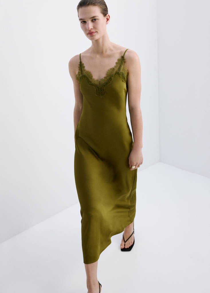 New NowSatin camisole dressCurrent price [€ 45.99 ]€ 45.99Select a colourGreenThe model is wearing size S and is 173cm tall.Select your sizeXSSMLXLSize guideAdd to WishlistSee lookFree delivery to storeSee availability in storeDescriptionSatin fabric. Long design. Fitted design. V-neck. Lace panel on the neck. Sleeveless. Thin straps. No Fastening. Inner lining.See detailsShare