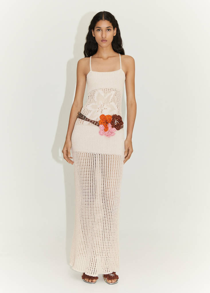 Cotton blend fabric. Knit fabric. Midpoint. Long design. Straight design. Maxi flower design. Openwork design. Square neckline. Sleeveless. Thin straps. No Fastening