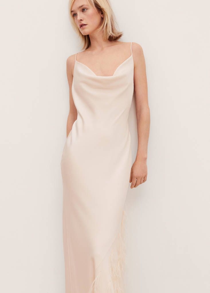 Its lingerie design, draped neckline and feathered finish make this garment the perfect choice for a special occasion. Its open back and fine crossed straps make it sophisticated and elegant. Fluid fabric. Satin fabric. Long design. Straight design. Draped neckline. Sleeveless. Thin straps. Invisible side zip fastening. Feather detail. Inner lining. Party, ceremony and communion collection. Items from the CAPSULE collection can be exchanged or returned within 14 days from the date of shipment