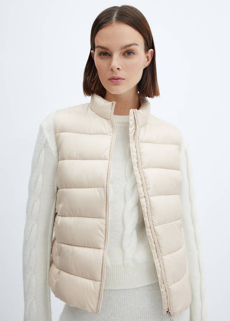 Quilted fabric. Straight design. High neck. Sleeveless. Two side pockets with one press stud fastening. Zip fastening on the front section. Inner lining. Available Plus. The white colour is an online exclusive. Water-repellent: The durable finish of this garment protects against light rain, repelling contact with water and raindrops. Short design. Side zip pockets. Recycled polyester padding