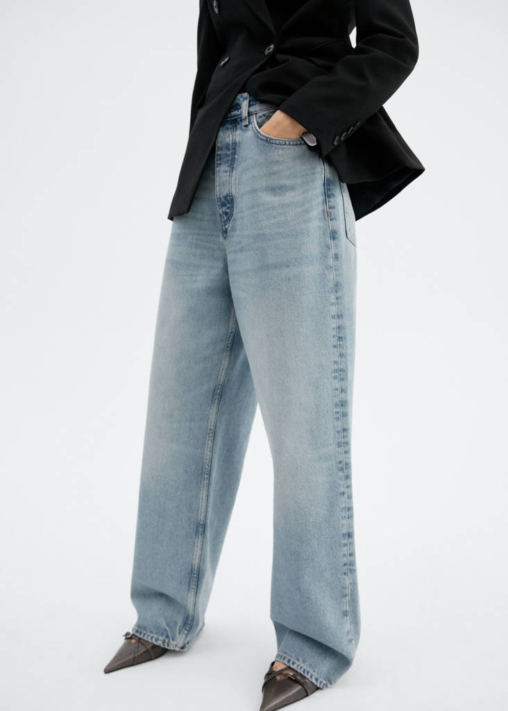Denim-style cotton fabric. Recycled cotton-blend fabric. Long design. Wide-leg design. Mid-rise. Five pockets. Belt loops. Zip and button fastening. Inner length 77.5 cm. Full length. Selection Collection