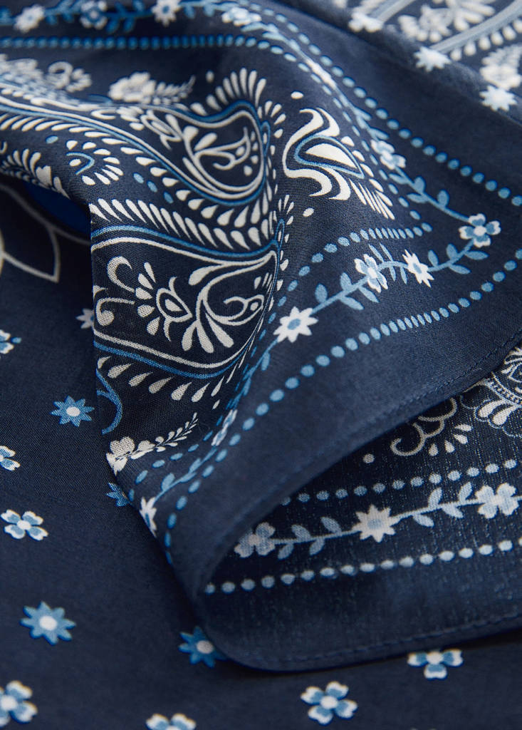 Printed cotton scarfCurrent price [€ 9.99 ]€ 9.99Select a colourNavySelect your sizeOne sizeAdd to WishlistSee lookFree delivery to storeFluid fabric. Square design. 100% cotton fabric. Printed design50.0x50.0 cmDetails, composition and careStore availability