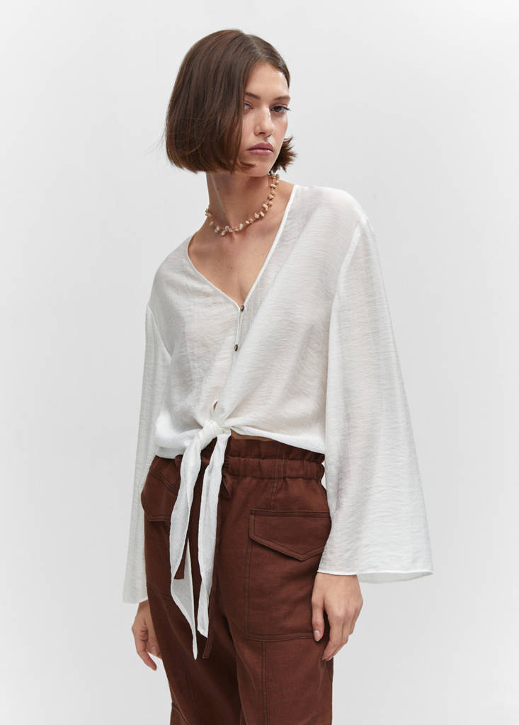 Fluid fabric. Shirt-style. Oversized design. V-neck. Long flared sleeve. Button fastening at the front. Adjustable tie. Office looks