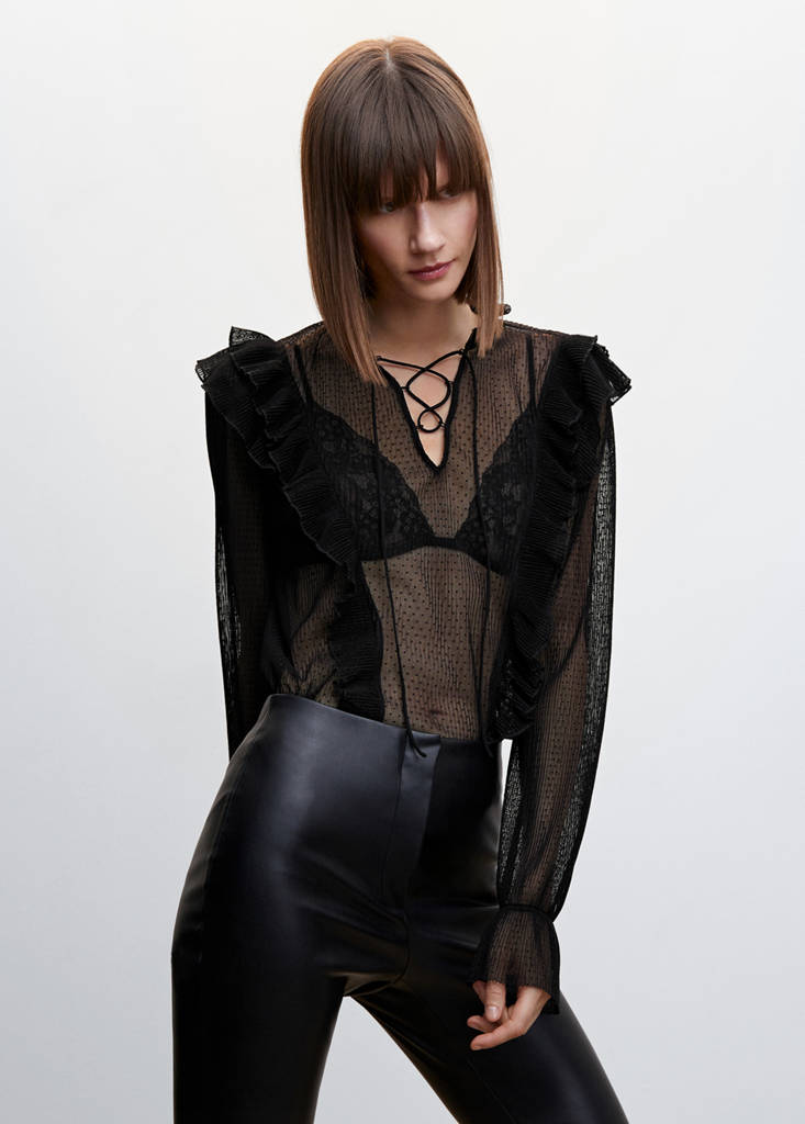 Flowy fabric. Spots print. Sheer fabric. Ruffles detail. V-neck. Long sleeve. Party and events collection