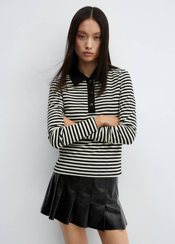 Button-down collar polo shirtCurrent price [€ 25.99 ]€ 25.99Select a colourBlackSmall garment - Choose one size up from the usualSelect your sizeXXSXSSMLXLXXLAdd to WishlistSee lookFree delivery to storeFine knit fabric. Straight design. Striped print. Polo-neck with button closure. Long sleevesDetails, composition and careStore availability