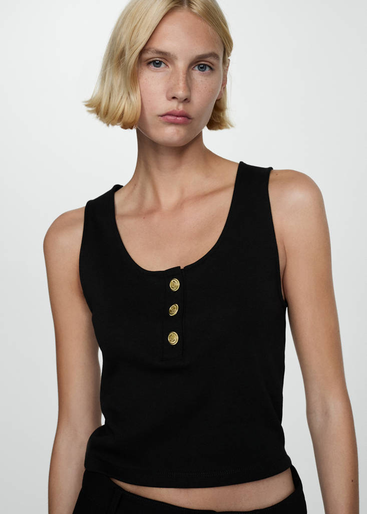 Top with straps and buttonsCurrent price [€ 19.99 ]€ 19.99Select a colourBlackThe model is wearing size S and is 179cm tall.Select your sizeXXSXSSMLXLXXLDimensionsAdd to WishlistSee lookFree delivery to storeStraight design. Striped print. Round neck. Sleeveless. Wide straps. Decorative buttons. 100% cotton fabric. Fitted designDetails, composition and careStore availability